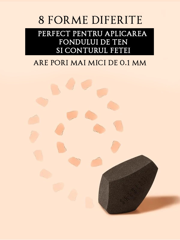 Asigură o aplicare simplă și rapidă pentru un aspect natural cu ajutorul setului de burete pentru machiaj cu diferite forme. Aplicați cu ajutorul buretelui fondul de ten pe zonele mari ale feței: obraji, gât și frunte, iar parțile ascuțite vă ajuta pentru zonele mai greu accesibile: nas și colțul ochilor, pentru extra precizie în aplicare și capăt pentru uniformizare optimă. Forma buretelui permite aplicarea uniformă a produselor cu textură lichidă sau cremoasă precum fondul de ten sau corectorul chiar și sub zona de sub ochi. Deasemenea Buretele este potrivit și pentru tehnica de aplicare al conturului și umbrelor.